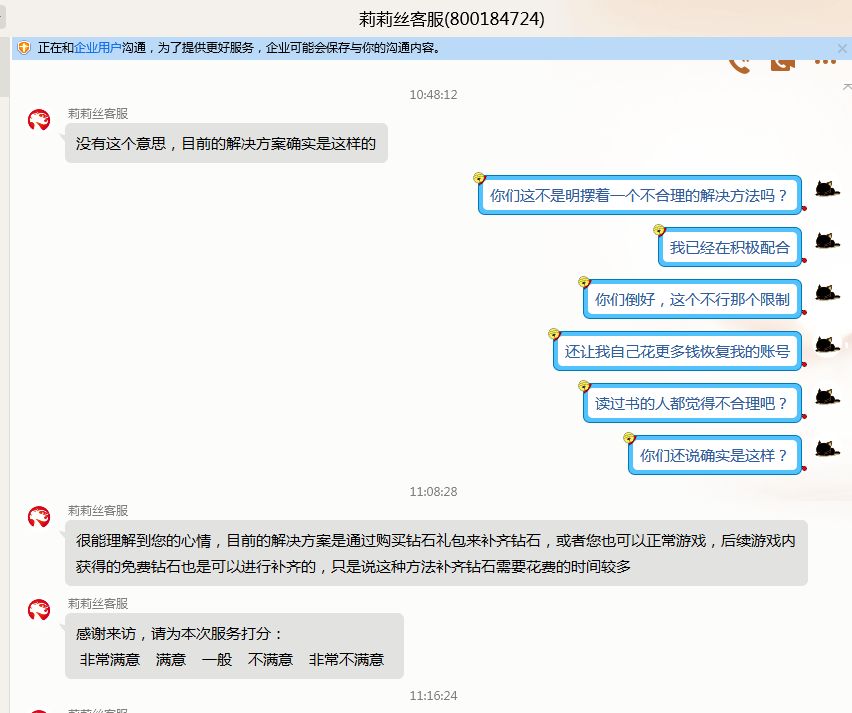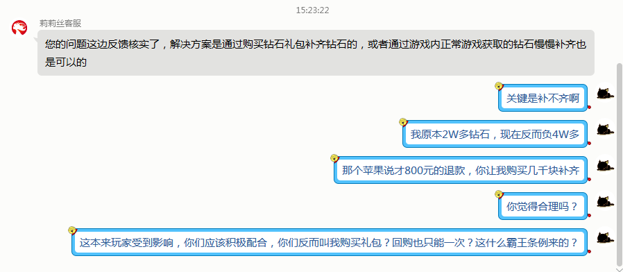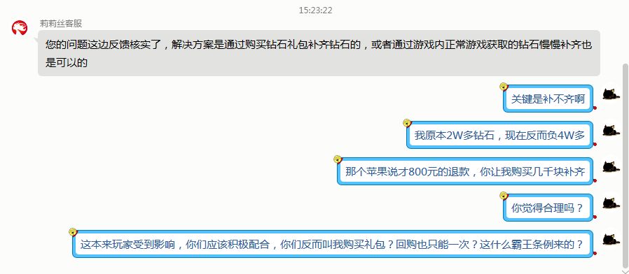 事情发生在昨晚,我发现游戏钻石显示负数,然后发现苹果IP被登录,然后联系了客服,也打了电话,结果只收到了无止境的充值安排,目的就是让我自己花钱买回损失的钻石。而且一直把责任怪在苹果那边,苹果都已经尽力了,然后客服一直劝我回购(只能一次),剩下的自己花钱去购买。我昨晚到今天一直联系看看怎么补救,客服大爷们就只会叫我充钱,我已经投诉到了12315那边了,各大无辜受害者要提前预防莉莉丝的潜规则。