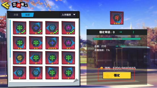 点击芯片,可以进行强化,强化需要消耗掉其他芯片以及金币。▽