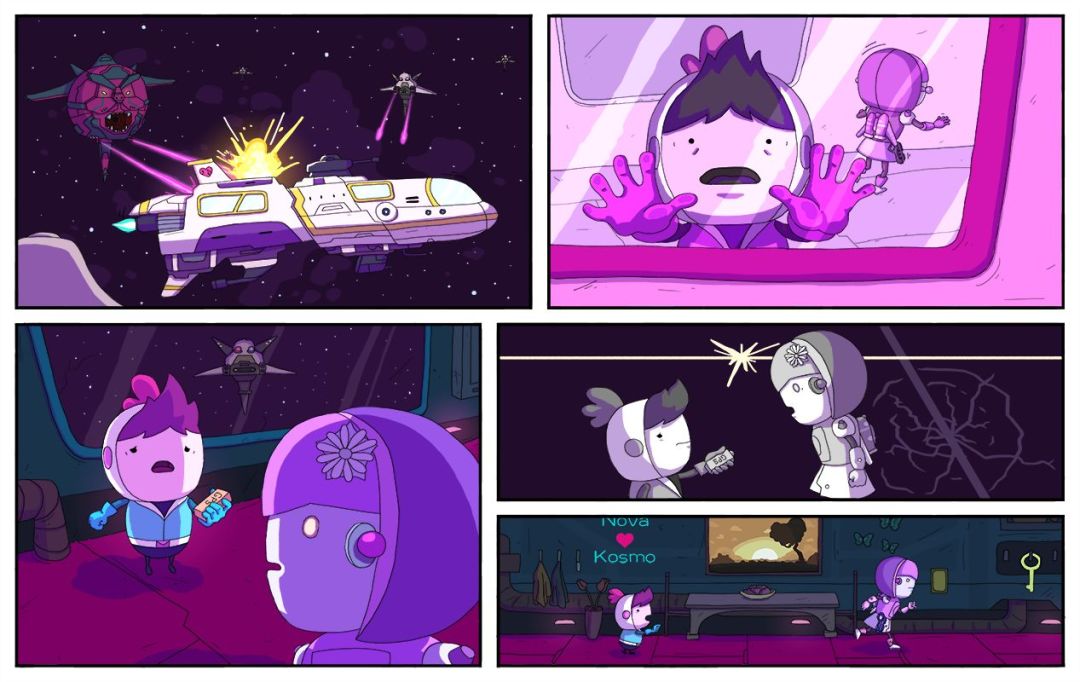从第一次Kosmo救下Nova开始,Nova的心中就留下了爱的种子。在Kosmo的星际旅行当中,每经过三个星球,Kosmo就会将记忆中Nova的点滴记录下来,描绘在不同的手绘漫画中。从过去到现在,Kosmo和Nova怎么在一起,而后又为什么分离,在这9副漫画中,也在这趟星际冒险中。