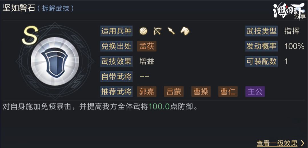 效果分析:指挥技能,开局百分百发动,不但能让携带者免疫暴击,还可提高全体武将100点防御。主公们一般会选择让后排奶妈或前排肉盾优先学习坚如磐石技能,这样可以有效防御“辕门射戟”等依靠暴击打伤害的技能,对“暴击张”(张飞+曹仁+辅助)、“水鬼队”(甘宁+孙权+孙尚香)等核心思路是暴击追梦的队伍非常克制。