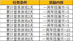 活动内容:活动期间,累计登陆游戏,即可获得一周年扭蛋币,抽取精美道具。