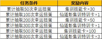 活动内容:活动期间,累计抽取幸运扭蛋星,即可获得集训训练卡以及仙道彰集训特训卡。