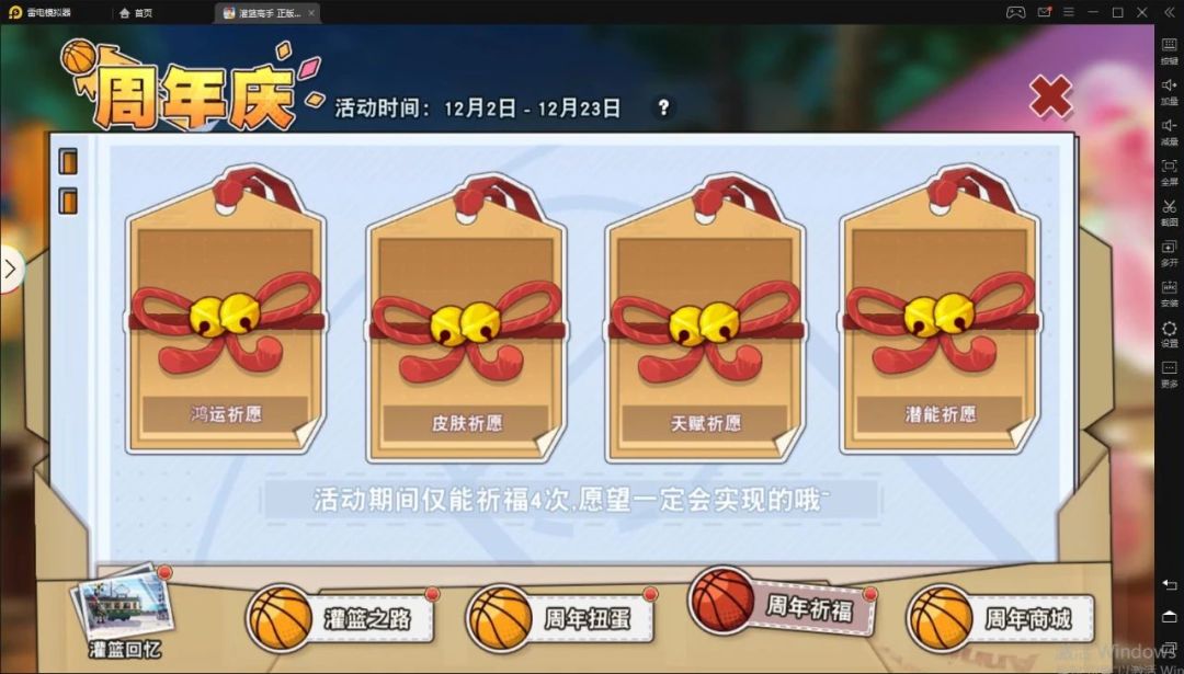 活动内容:祈愿时间内,可在“鸿运祈愿”、“皮肤祈愿”、“天赋祈愿”、“潜能祈愿”中选择4个不同的祈愿奖励。12月5日0点开启领奖,届时登陆游戏即可领取。(小晴提示:必须在祈愿时间内选择奖励,否则将无法领取哦)