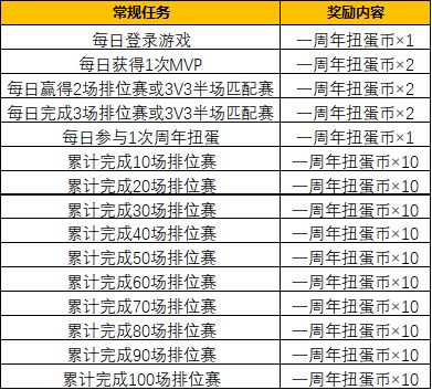 活动内容:活动期间,完成周年庆扭蛋任务,即可领取海量一周年扭蛋币。小晴提示:每天参与3V3半场匹配赛/排位赛,还将额外掉落一周年扭蛋币(胜场掉落2个,败场掉落1个。每日上限获得10个)。