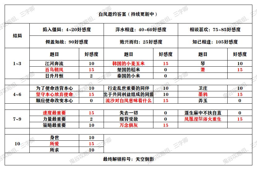 首先感谢三字卿大大倾心创作,各位少侠期待已久的本命侠客邀约答案,南公已经联合攻略小组准备完毕啦!历时一个月半的不断测试和整理终于完成了本命侠客所有邀约答案选项!
