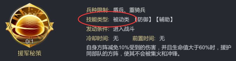 辅助技能相对于伤害技能来说,其主要是偏向于增加兵种的强度、防御或是添加效果,技能描述中无任何与自身武力、谋略相关的字眼。比如张仪的技能。