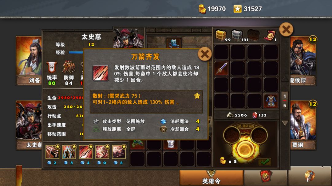 3技能,万箭齐发,俗称箭雨。核心180%外围130%。太史的范围群伤技能。主要用于补刀,也可以用刘备血煞太史慈以起手三箭雨为主要攻击方式。