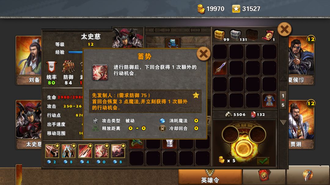 技能5,全军突袭。太史慈招牌技能,远程连携技能。若开了1技能,太史强制远程,连携射三连珠。在新人阶段,该技能配个蛮皮七星刀,把鹰卫分散,一回合内能达到上万的巨量伤害。因此新人特别喜欢用。