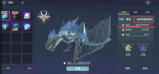 上图左边骨龙等级,左边是宠物当前等级,右边是宠物最高等级,也就是宠物灵气获取上限。目前还没有办法可以突破。