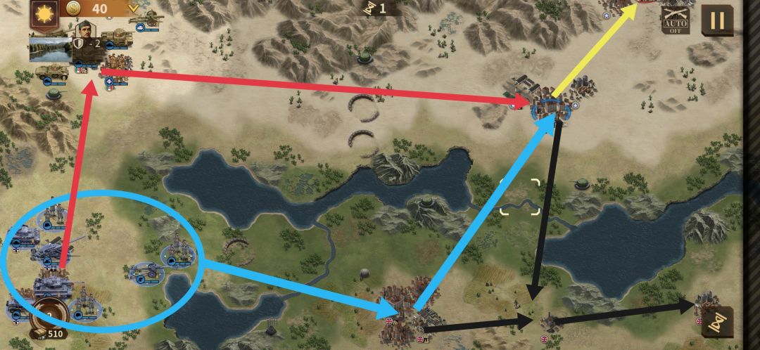 黑线为奇袭部队,由重坦古帅带队,二编坦,二编炮,三编步随行。