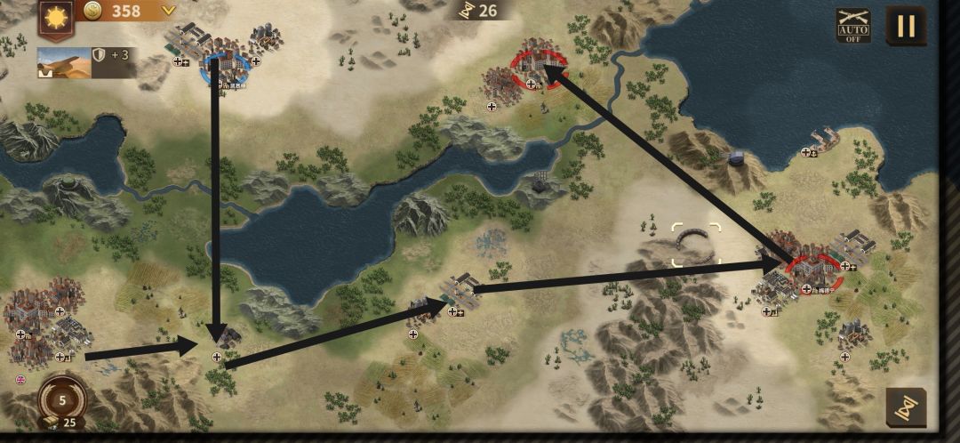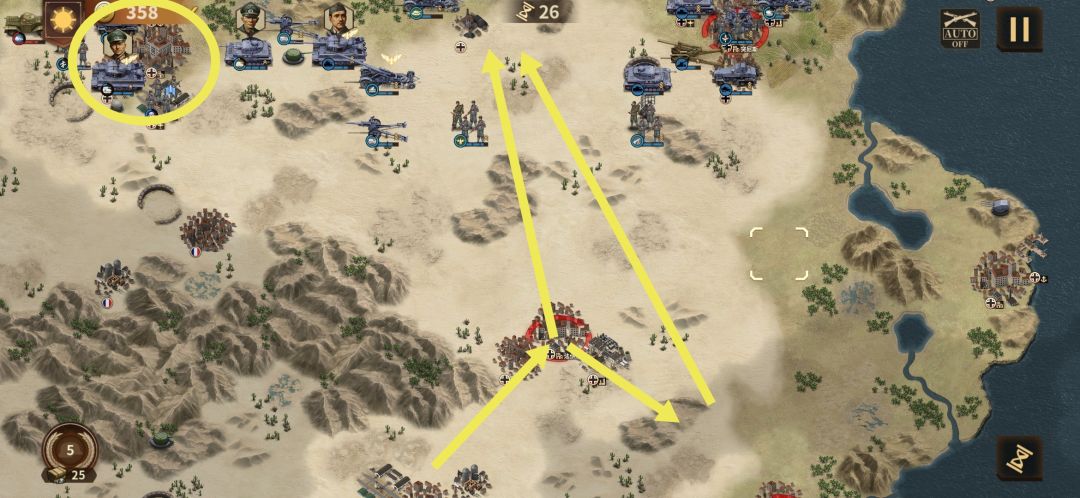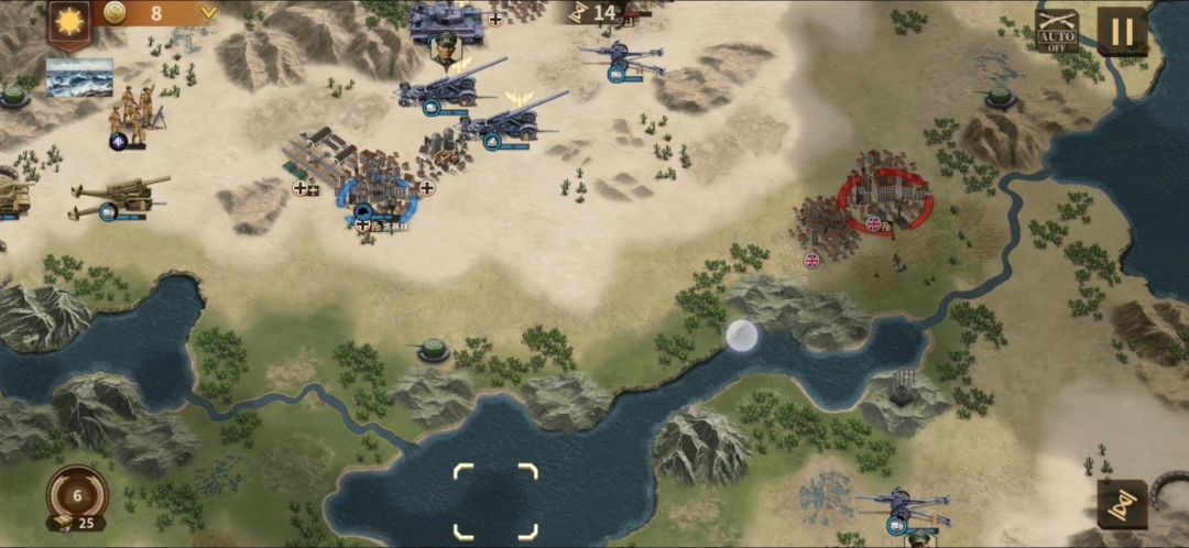 图中红圈城为敌军防线所在。如果占领会触发蒙哥马利的空军支援,反之,则敌支援空军会缩在右下角待命。