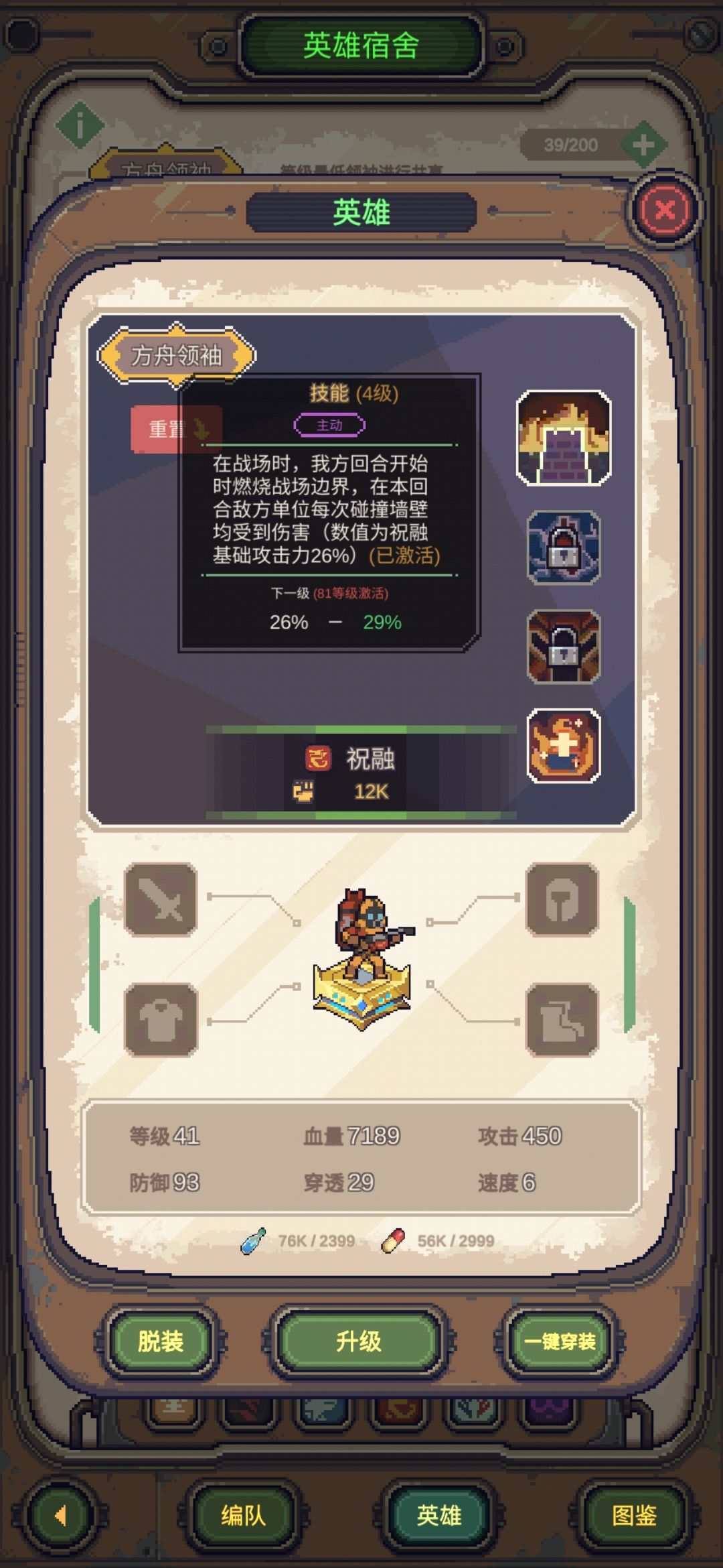祝融在场时,己方回合内敌方撞墙受到一次伤害,升星过一次后每次敌方撞墙会给祝融回血。