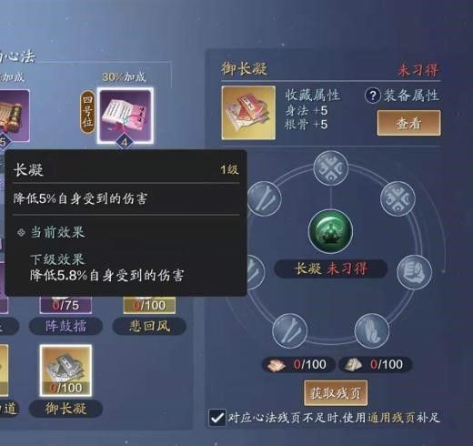 《风华·玉碎》对暗伤率的加成不可或缺,尤其是在使用范围攻击或治疗技能时,开始心法主动收益十分高。二号位和三号位分别使用《炼武·气劲》和《炼武·身法》加强我们的四维属性,身法的加成配合上四号位的《御长凝》,能让我们在乱战中保持自己的状态。