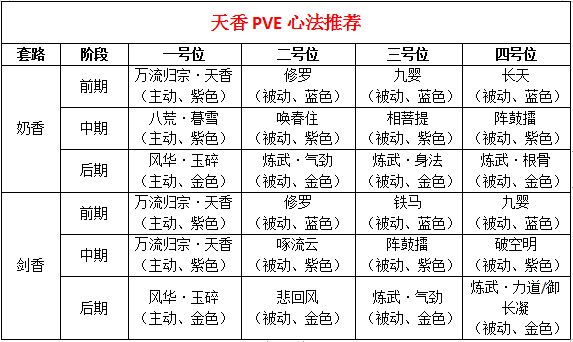 在PVE中天香主要定位是治疗和输出,在话本中以治疗为主,而在天波府挑战等玩法中也会考验到我们的输出能力,所以接下来就为少侠们分别推荐奶香和剑香的心法搭配。