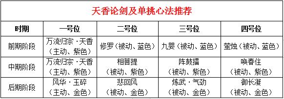 整体来看,天香在论剑以及单挑的心法选择上少侠们可以参考下表进行选择: