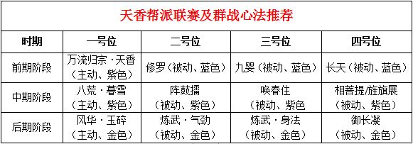 天香在帮派联赛及群战中的心法搭配少侠们可以参考下表: