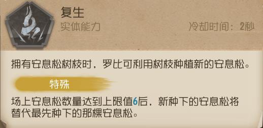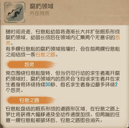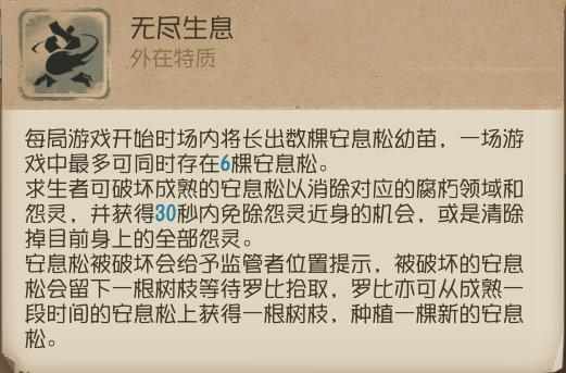 ①种植新的安息松生成的两个怨灵会朝爱哭鬼面朝方向生成,并左右分开围绕安息松旋转,学会灵活运用【除怨】能更好的在板窗之间与求生者博弈;