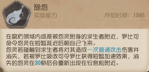 ①附身于求生者身上的怨灵仅存在30秒,如果在怨灵快消失时使用技能【除怨】,怨灵会在飞行途中直接消失,并刷新【除怨】技能CD;