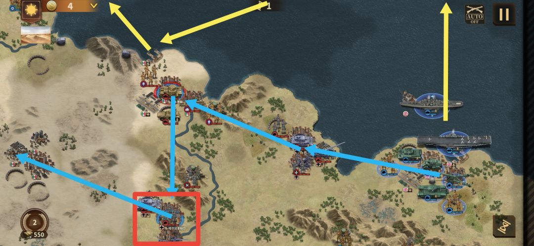 黄线为海军行进路线,主要任务为堵住敌方补给舰,阻拦敌方支援舰队,辅助陆地主力火力。