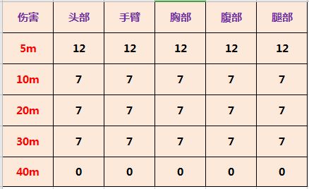 伤害方面:基础伤害90点,在所有霰弹枪中属于偏低的数值。伤害表中的数值是单发散弹伤害,Striker一发子弹是8颗散弹。此外在实际测试中,在5M以内的近距离,Striker是可以一枪淘汰敌人的,所以预计5M内的单发散弹伤害在17点左右。