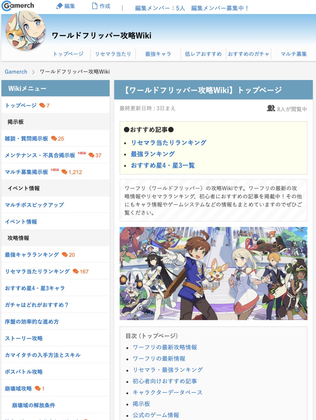 两个wiki都是按主题分门别类整理的,内容更新也及时,主要的关键内容有这几个:刷初始相关攻略(リセマラ当たり)、节奏榜(最強キャラ)、组队攻略(最強パーティ)