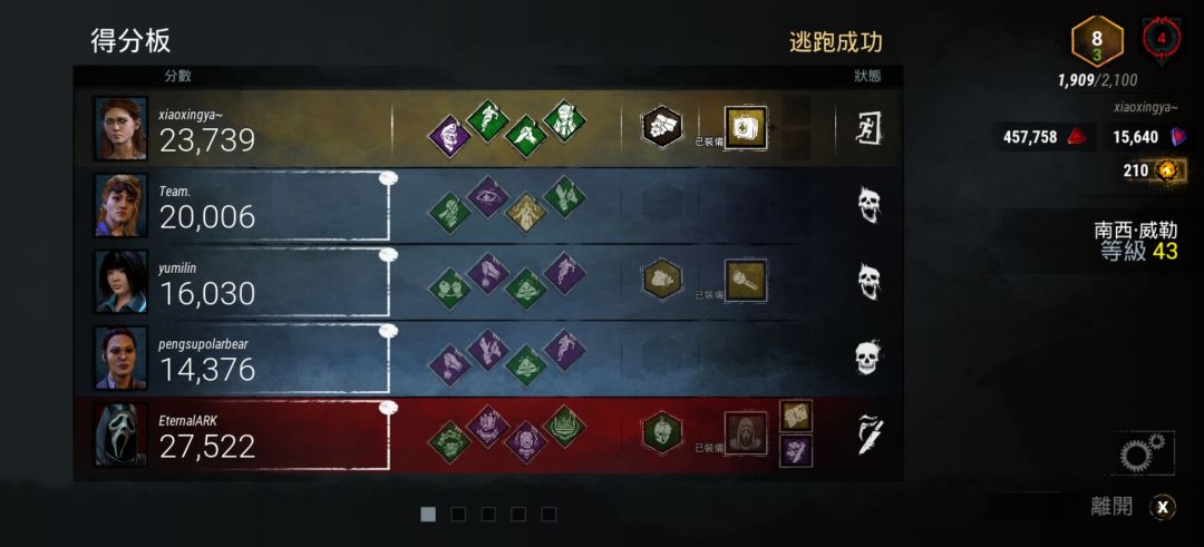 现在队友真的是,牛皮操作一大堆,这两个人在门口互摸,鬼面直接危险状态搞死一个人,另个人用手电筒去照在鬼面鬼面扛人时打两刀,门皇我见过,但3跑局变成1跑局还会死两个我是万万没想到的