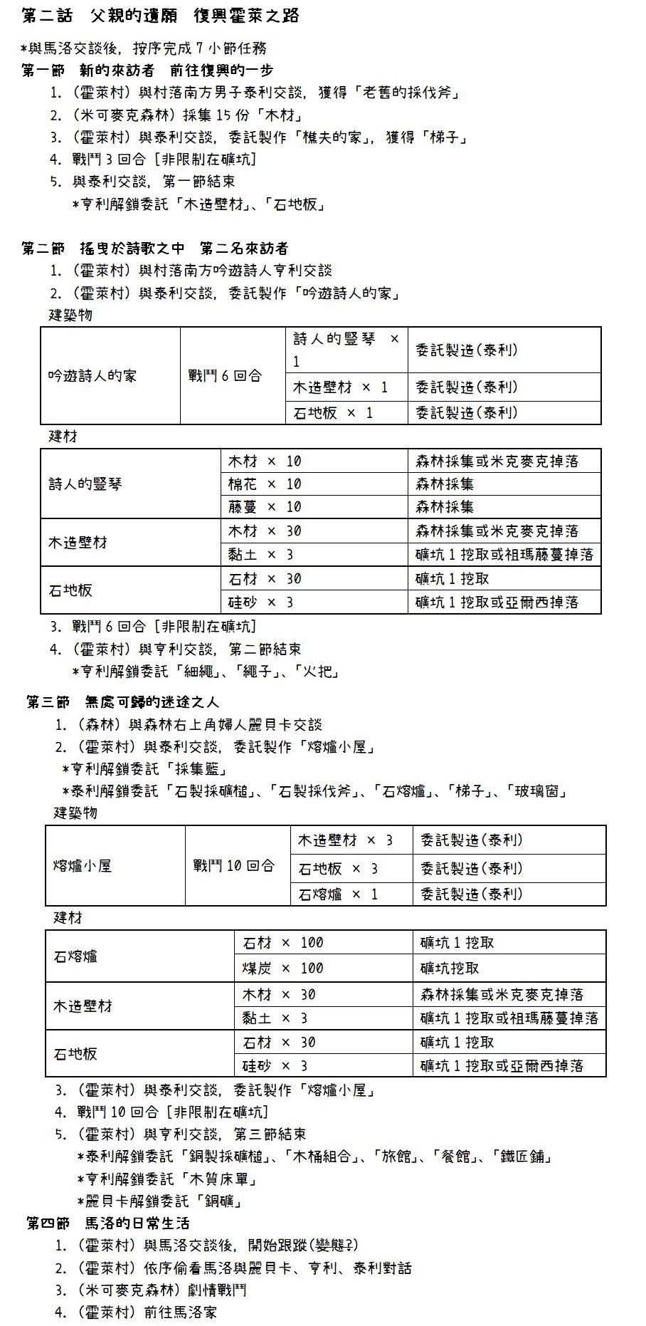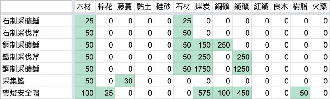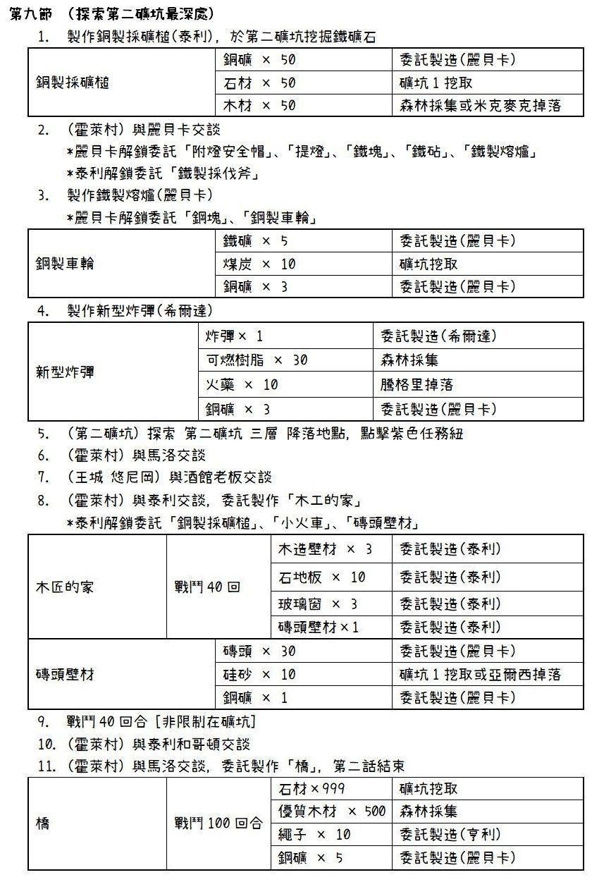 ④石炭/煤炭的需求量极大,其次是铁矿石,因此每次去煤矿都应该采完。粘土/黏土和石英砂/硅砂只有1个采点(在煤矿1),前期去煤矿都应该采完,打小怪也会掉落,但等造完戈登的家后基本就用不到了。