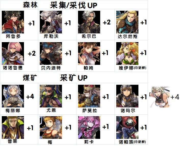 ②基础获取量=4,特定角色(个性有写)在队伍中时会有加成,如下图,采矿除了诺玛尔外都是拿锤子的。