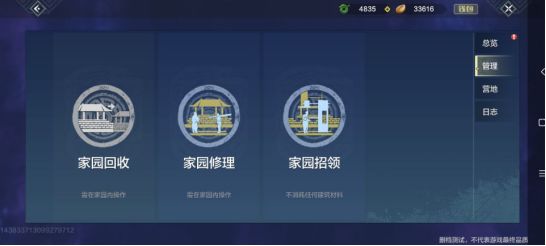管理界面细分为①家园回收顾名思义,就是对家园整体进行回收,方便玩家重新选址建造。所有家具会通过邮件返还给旅者,基建则会以材料的形式返还给旅者。需要再次建造房子时只需把灵池再次放到可以放置的土地上,即视为已经完成搬家。(家园需要重建哦~)