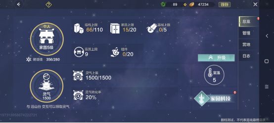 来到此界面,我们可以清楚的了解到自身家园的等级,当前家园等级的结构上限,家园上限,器械上限,家园范围以及挂件数量,同时,在家园图标的下面我们会看见建造值,当各位旅者的家园建造值达到上限后便可花费一定的材料进行家园升级从而解锁更多的结构和占地面积等(建造值可以通过摆放家具,建造物品例如墙,楼梯等提升)。紧挨着家园的,是我们的灵气值,这个灵气值也就是咱们的经验值,当玩家解锁灵器,远山台的时候,通过纳灵功能来获取储存的灵气,灵气随着时间进行恢复(PS:各位旅者记得及时领取,别浪费了哦)