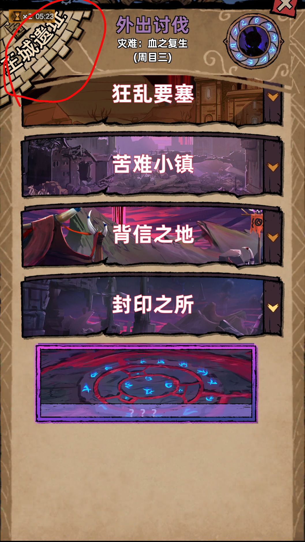 通关三周目后开启,战斗左上角王城遗址进入,王城分为内围、外环、前厅,内围、外环三周目开启,前厅五周目开启