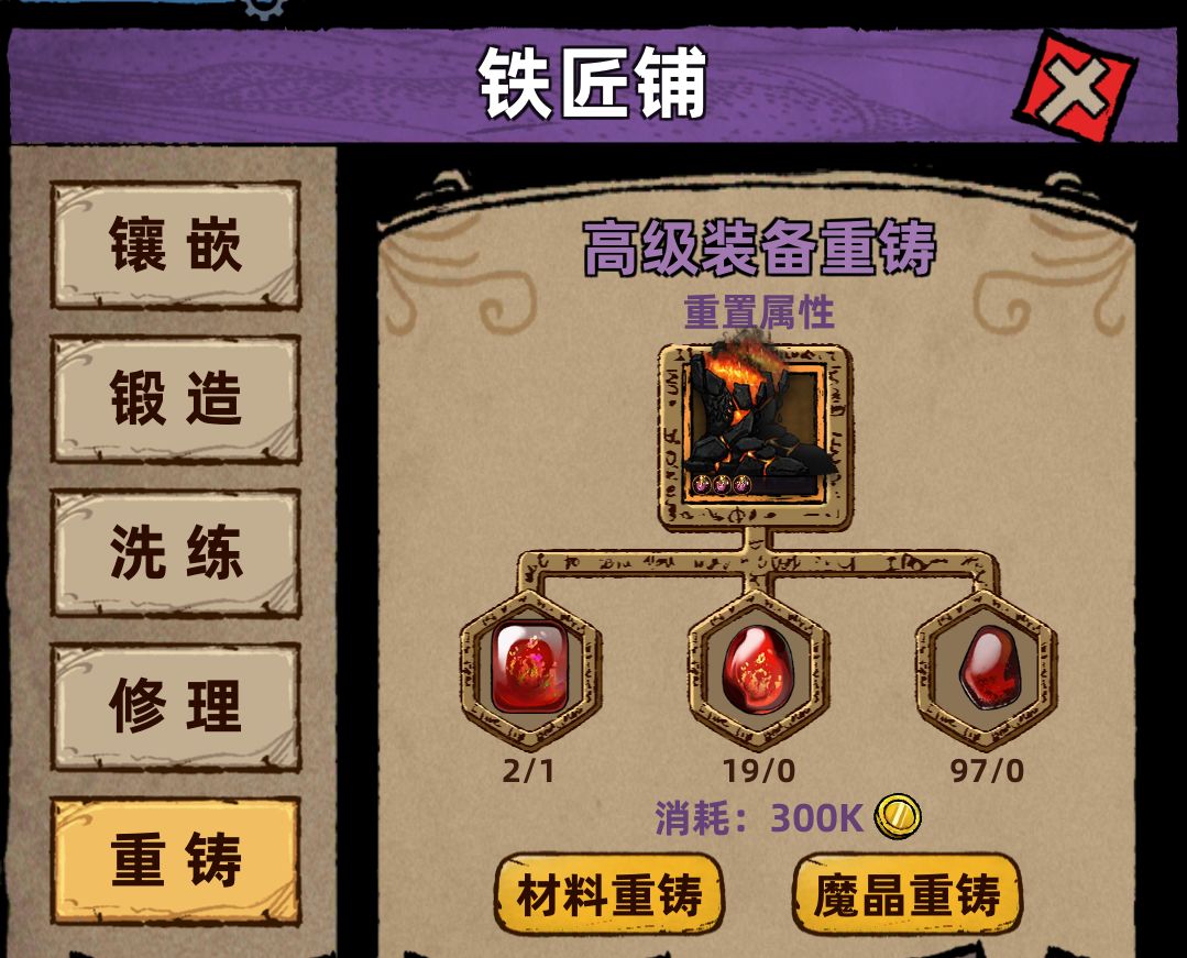 重铸100级解锁,铁匠铺进入,只可重铸100级装备,重铸需消耗血珀,三种血珀有且仅有王城掉落