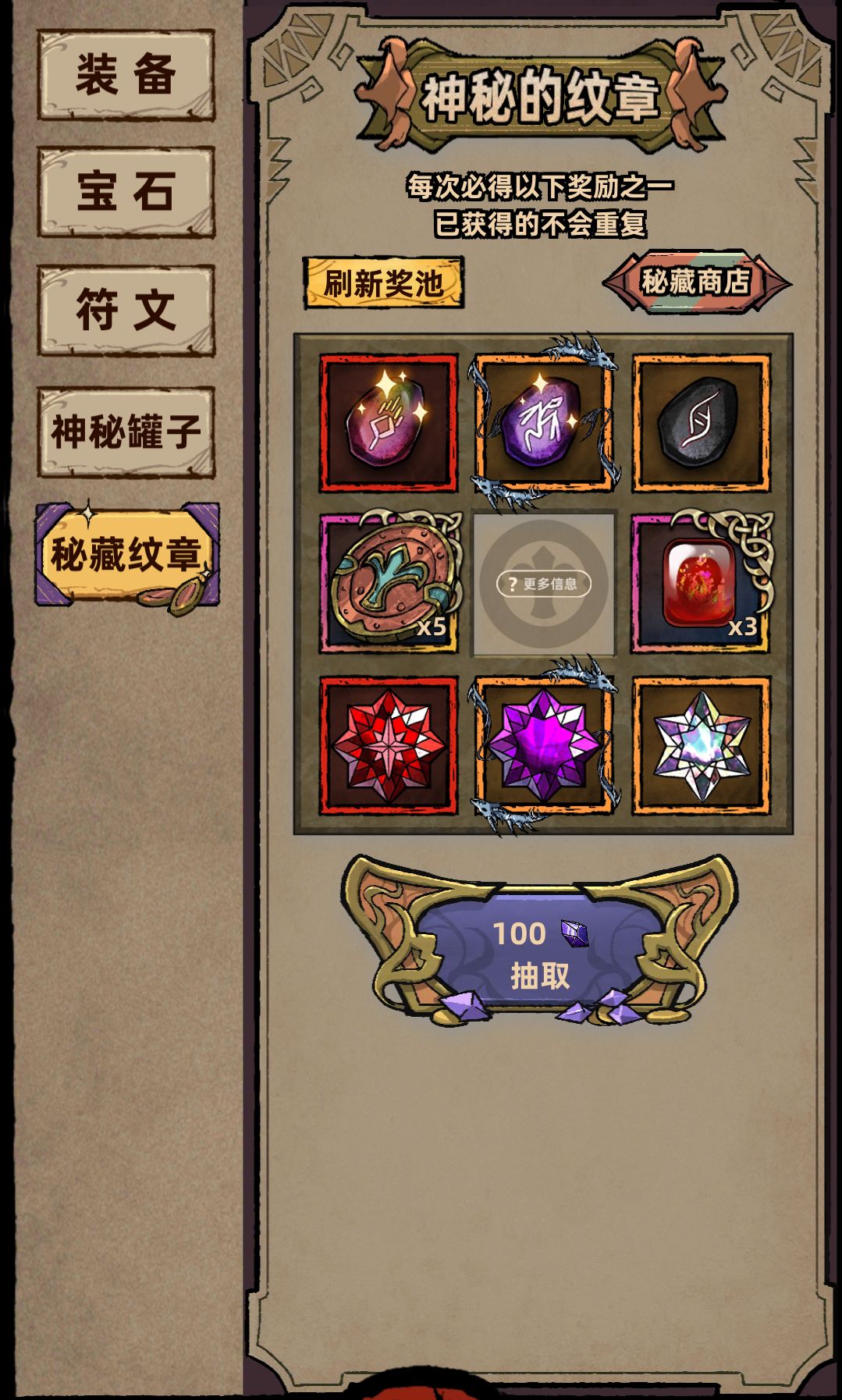 第一次抽取需100魔晶,之后每次递增100魔晶,拉满共需3600魔晶,秘藏纹章可在秘藏商店兑换套装