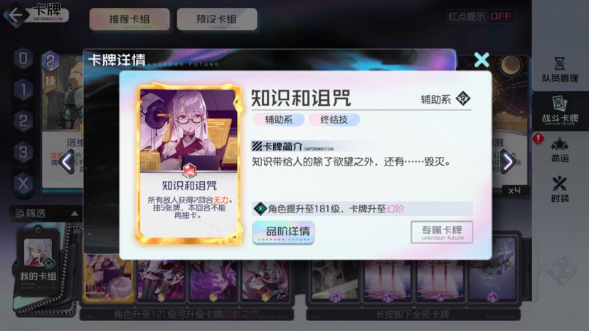 但是在我们跨等级极危到一定程度时候,到后面二支援已经支撑不了的时候,我们可以换成二输出一支援比如白鹭古城佐伊(古城专属消耗卡牌减一)而压缩卡组梅塔也是一个好手(楼主没出,可看其他攻略学习,经常绿未来梅塔白鹭古城佐伊苔丝一起相互搭配。具体压缩卡组操作需要大家多使用,多看牌堆,卡组多变,保障低费开大,卡池压缩搭配便可。