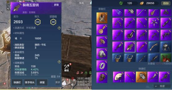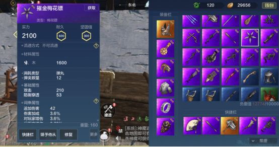 梅花镖每次射击打出两发子弹,射速中等,换弹速度中等,弹药类型为弹丸,一个弹夹有12发子弹(弹夹容量会随武器品质而变化,变化量不大)