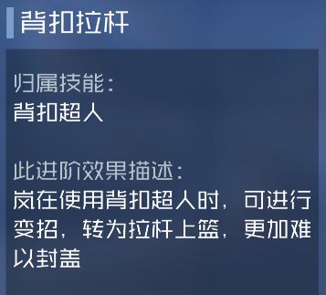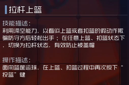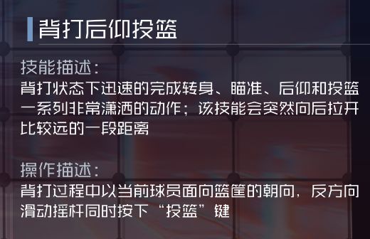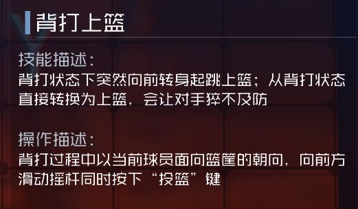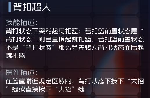 背打时获得增益效果:增加投篮和上篮命中率,持续8秒。被动生效。爆发技能-背扣超人