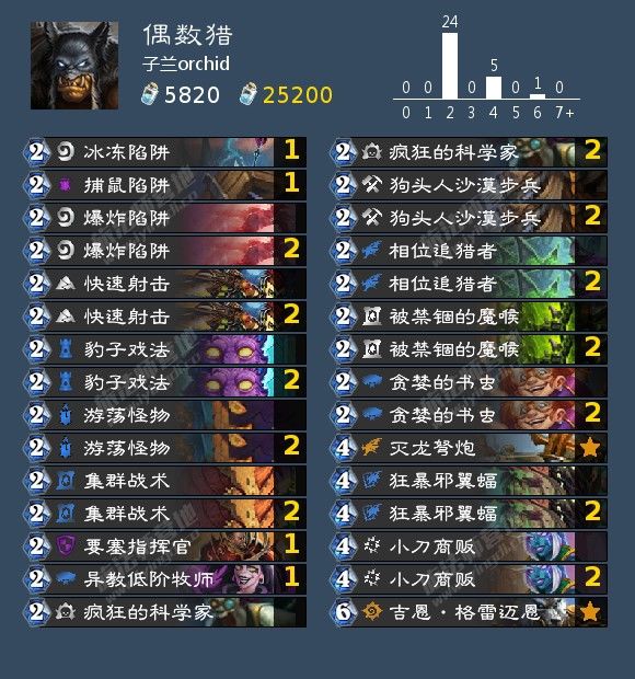 偶数猎在之前版本的三个问题:1.后续直伤2.过牌3.先手情况下的返站场手段。这套偶数猎在有了贪婪的书虫可以尽可能的压低曲线,新版本小刀商贩给了偶数猎新的直伤手段,并且可以直接零费拍下狂暴邪翼蝠,先手情况下也有集群战术奥秘在三费进行一波反场,在一定程度上解决了奥秘猎以前的三个问题。(若是未来版本给猎人更好的直伤手段,这套卡组只会更强)携带了的一张捕鼠陷阱是为了针对当前版本的奥秘法,奇数瞎,大哥牧卡组,没有的同学也可以用第二张冰冻陷阱或者异教低阶牧师替代,其余奥秘可以对自己喜好更替(推荐奥秘携带数量为10张,刚好三分之一)