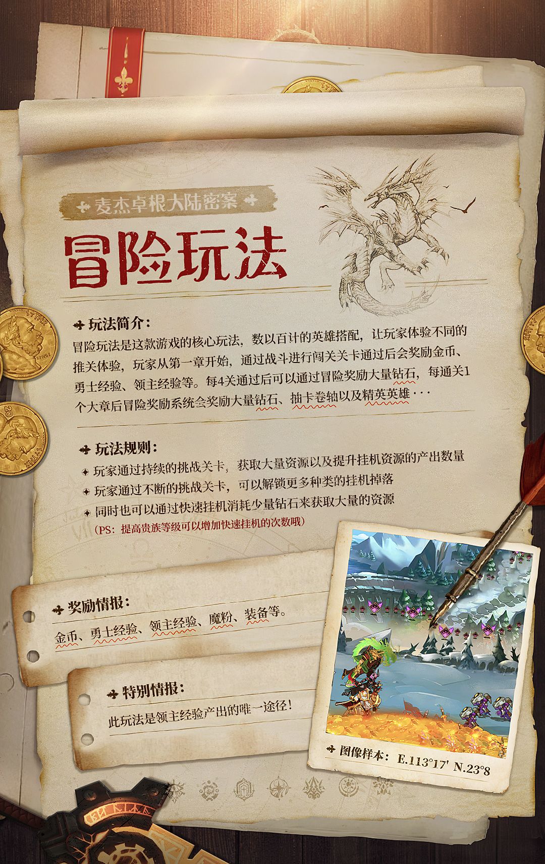 每通关一个大章后,冒险奖励系统会奖励大量的钻石、抽卡卷轴以及强力英雄,帮助领主继续深入探索更危机四伏的麦杰卓根大陆