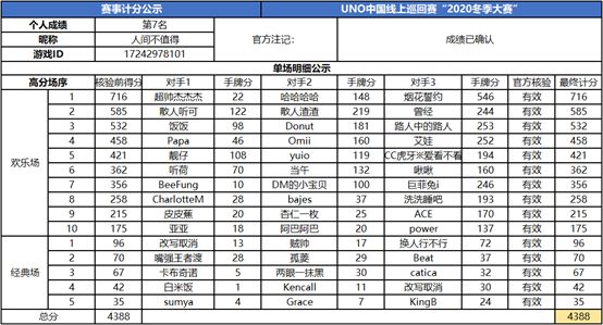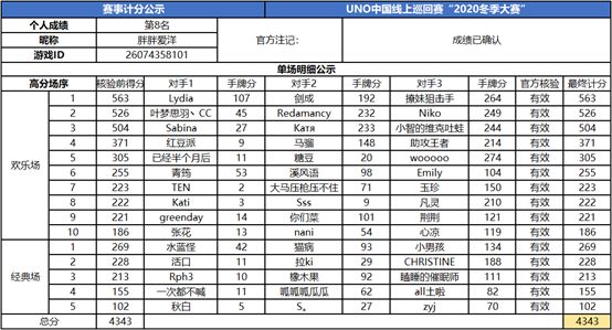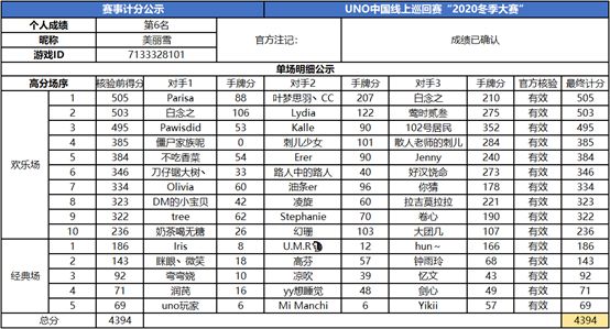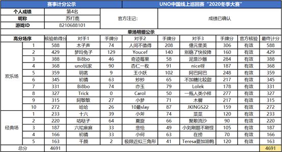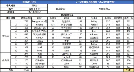 以上就是2020UNO线上巡回赛“2020冬季赛”的战报内容,为了保证我们巡回赛的公正公平,根据规则,至少完成10场欢乐场及5场经典场的参赛玩家才会判定完成本站巡回赛,而利用多开或其他违规操作的选手我们将取消本次巡回赛成绩。