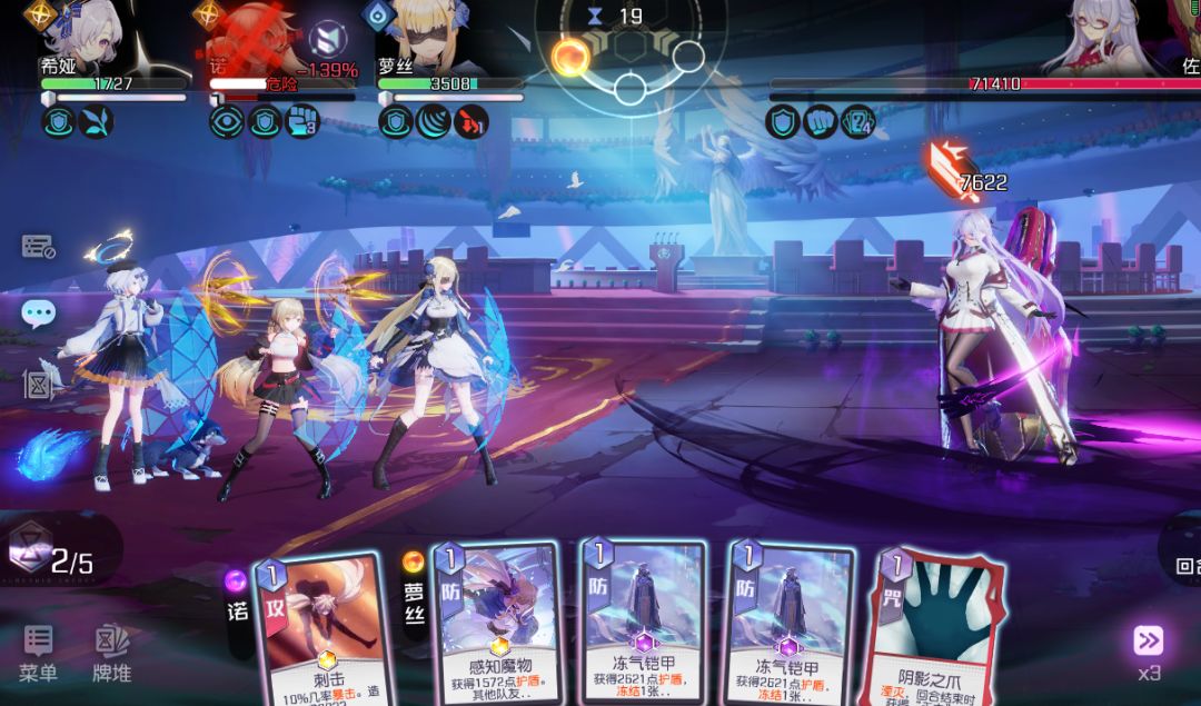 其实[诅咒]无力卡牌本身并没什么,关键是BOSS佐伊攻击伤害会增加50%,[影子]三回合来一次,第十回合基本上队伍人手一张[诅咒]卡。所以在有效时间内清除[诅咒]卡是获胜的关键!旁白君:熟悉的套路啊,全用冻结卡完事!