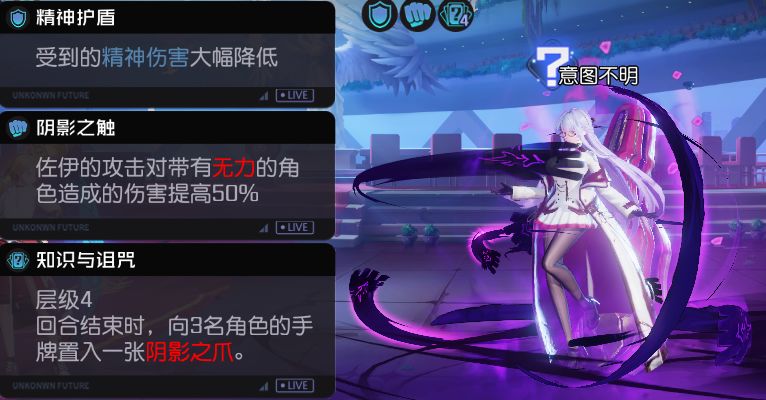 a.每回合佐伊会给角色一张1费的[诅咒]卡牌,如果回合结束不打出或者冻结就会获得[无力]状态,BOSS攻击[无力]卡牌时伤害提升50%。