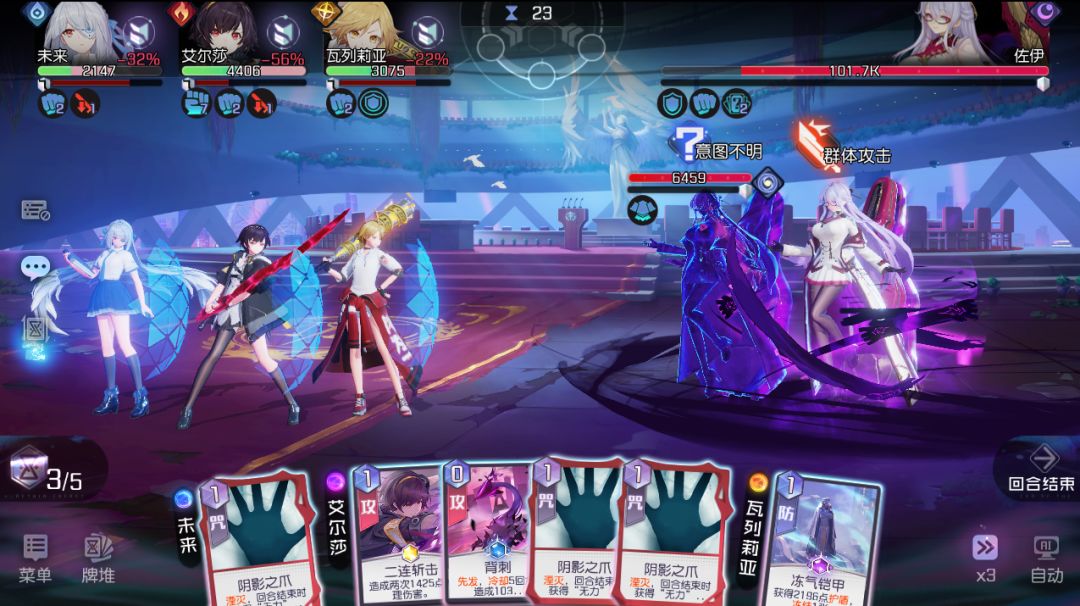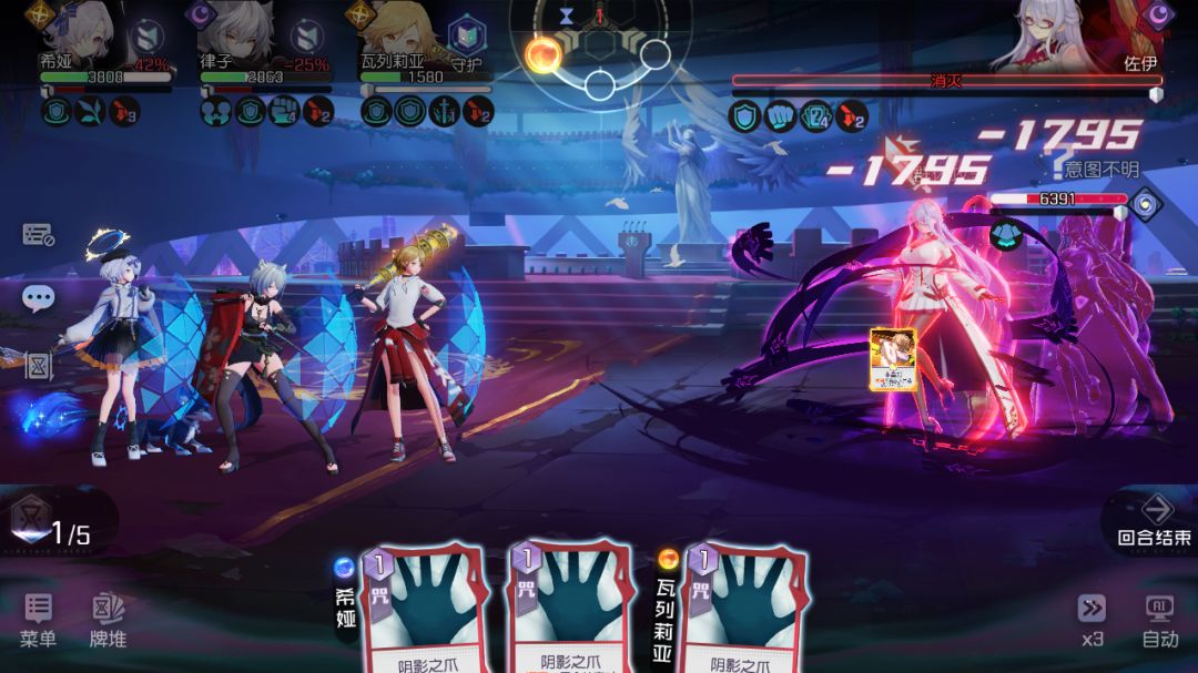 打法其实很简单,就是通过0费1费(费:能量消耗)的卡竟可能的打出大招并且还有多余的能量把[诅咒]卡打出去,让律子输出。战力和等级低的小伙伴,切记!切记!切记!一定不要贪输出,BOSS攻击模式是单群随机切换,以保障全队满血满盾为主,律子卡级不高的可以带[处刑]和[背摔],最后输出一定够够的!