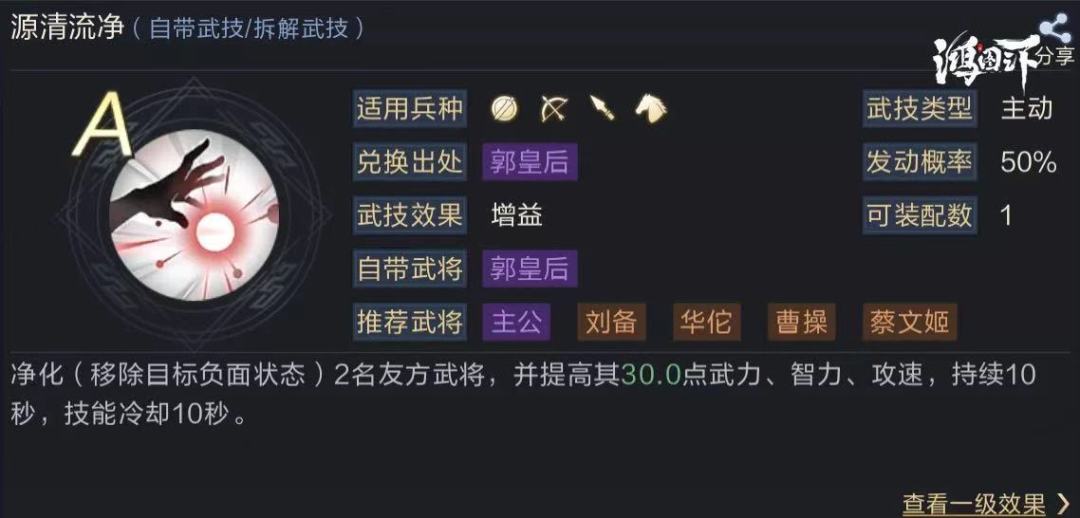 该武技是A级中最为优秀的净化类武技,单论净化效果的话比一些S级的净化武技更加好用。首先,该武技由携带者发动,精准净化2名友方武将,不具有随机挑选或兵力最低等限制条件。该武技除了有净化效果以外,还会为目标提高不少三维属性,在大多数需要稳定输出的队伍中非常热门。