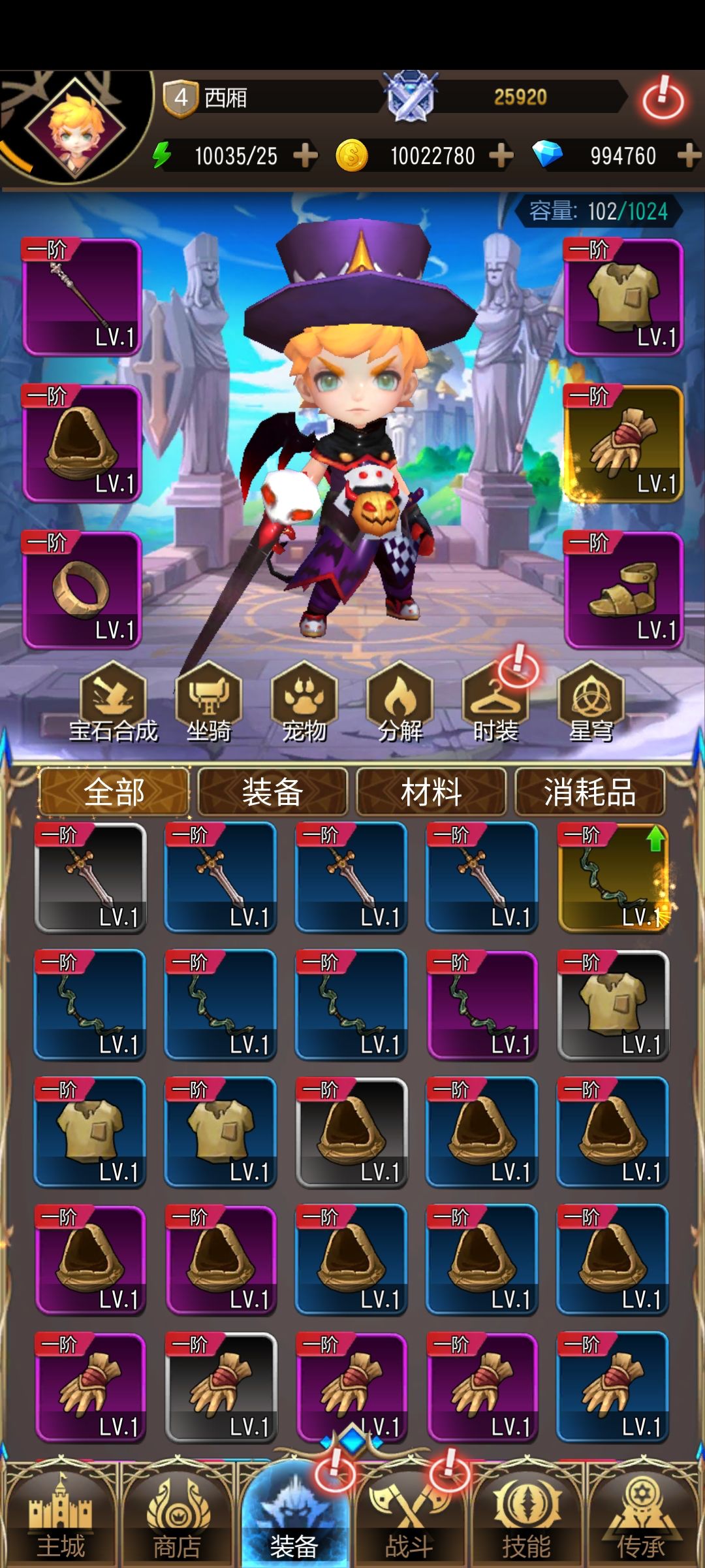 装备可以进行升级、分解以及宝石镶嵌。冒险者关卡掉落的装备消耗金币即可升级。点击人物接口分解按钮进入分解接口分解装备,分解后获得一定数量的金币和精铁。精铁主要用于装备的重铸,重铸后基础属性和附加属性都有小幅度提升,多次重铸能够突破当前质量,升级到下一质量。但要注意的是精铁每日的分解上限,达到上限后只能获得金币。
