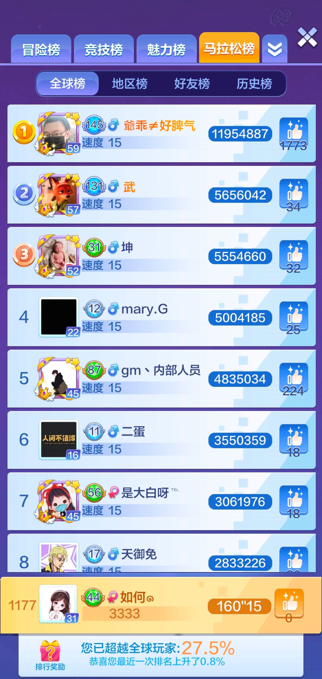 又到了大家每周所熟悉的马拉松排行榜,本周赛季手Q排名大更迭,排行前三的大神们全是横空杀出来的黑马!目前排行第一的大神是“啊啊啊”,总积分高达10261565,远远拉开了与其他大神的差距;排行第二的是总积分成绩为5667676的大神“浅喜”,想必面对不断掉落的方块她必然是游刃有余;排行第三的是大神“涛”以4767239的总积分紧随其后。不过从目前的排行榜积分上看,第二、三、四位之间的积分差距并不大,想要稳固自己的排行榜位置,大神们还需要持续提升自己的技术及成绩呀~