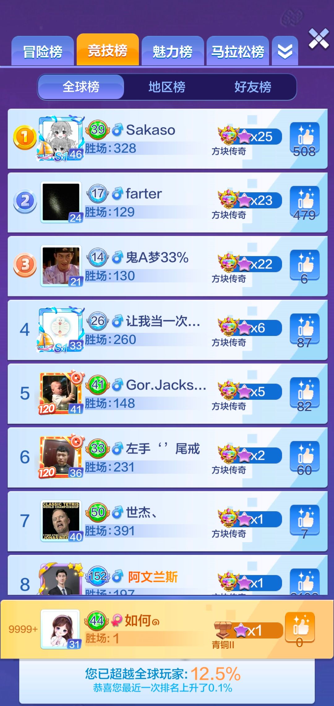 本周微信区竞技榜排名也再度刷新,上个赛季排名第三的大神“Sakaso”成功逆袭,目前以方块传奇段位25星且胜场328场位于第一的位置,恭喜这位大神!上赛季位于第一的“farter”目前位列第二,段位与胜场相较上周来说无变化;排名第三的“鬼A梦33%”目前段位与胜场相较上周来说也无明显变化,打块大神们可不能放松警惕呀,不然就可能被反超排行榜排名了!