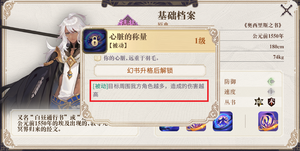 《奥西里斯之书》奥西里斯的被动效果是攻击目标周围的我方角色越多,伤害越高。因此他是单体爆发输出相当高的幻书。搭配拥有分身技能的《亚森·罗宾探案集》罗宾,以及可以召唤宠物的《死海文书》伊芙,就可以打出不俗的伤害。