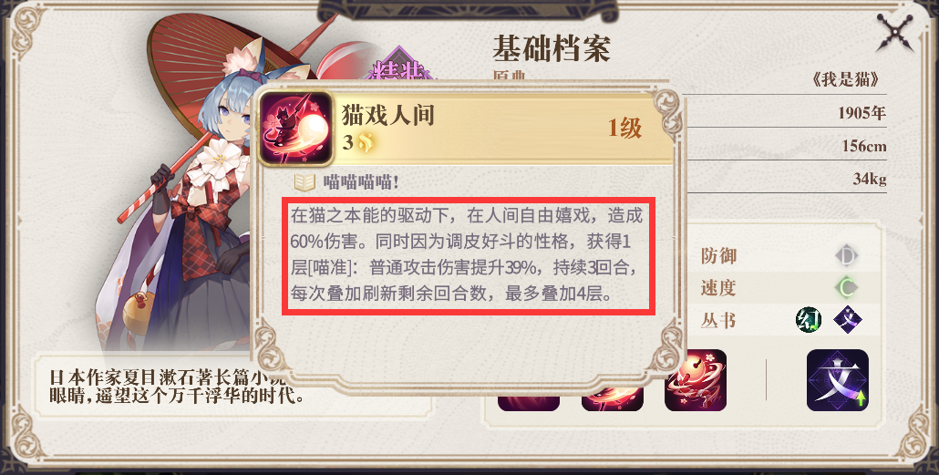 《我是猫》宁子的书界技能可以为自身的普通攻击叠加增伤效果,同时被动会在其他我方幻书攻击时进行协同攻击,因此她是单体持续输出最高的单攻幻书。配合卡琳的集火,宁子的输出可以得到最大的发挥。