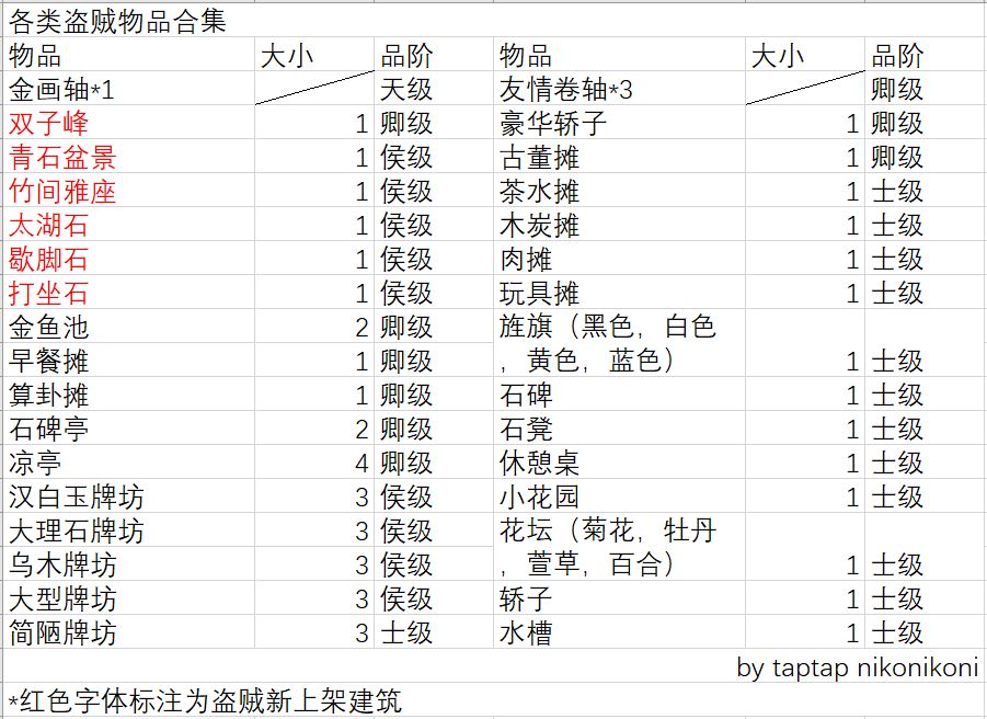 下图是根据评论区及我自己统计的各类盗贼物品合集,统计不完全,仅供参考。