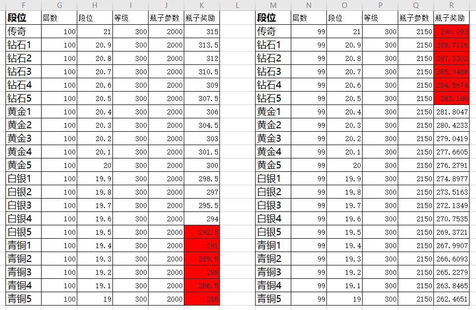 100层数奖励*21传奇段位*300级/奖励参数2000 = 315